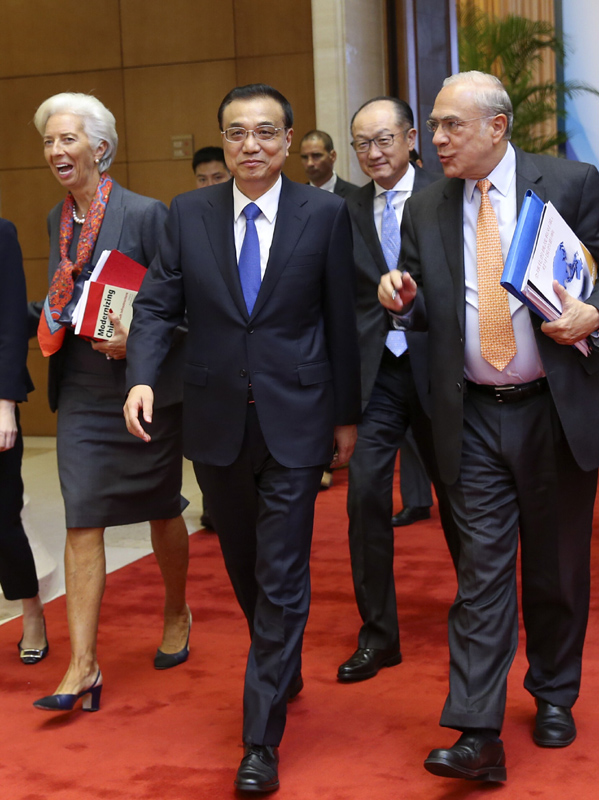 国务院总理李克强9月12日上午在钓鱼台芳华苑同世界银行行长金墉、国际货币基金组织总裁拉加德、世界贸易组织总干事阿泽维多、国际劳工组织总干事莱德、经济合作与发展组织秘书长古里亚、金融稳定理事会主席卡尼举行第二次“1+6”圆桌对话会,在会议第二阶段围绕“推动中国经济转型升级”主题深入交流。